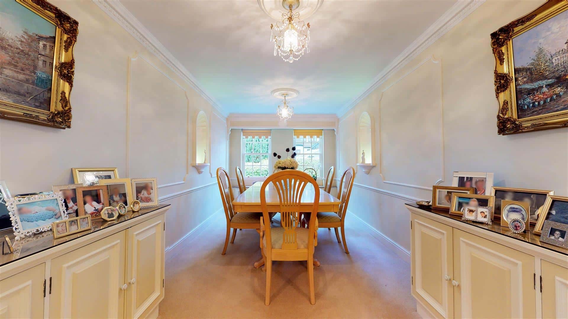 The delightful property is set over two floors with the ground floor comprising of elegant entrance hall, large formal living room, dining room, kitchen/breakfast room with large sliding doors leading onto rear patio, cloakroom and internal access to the double garage and utility room. The first floor features master bedroom with walk in dressing room and en suite, two further double bedrooms and family bathroom.