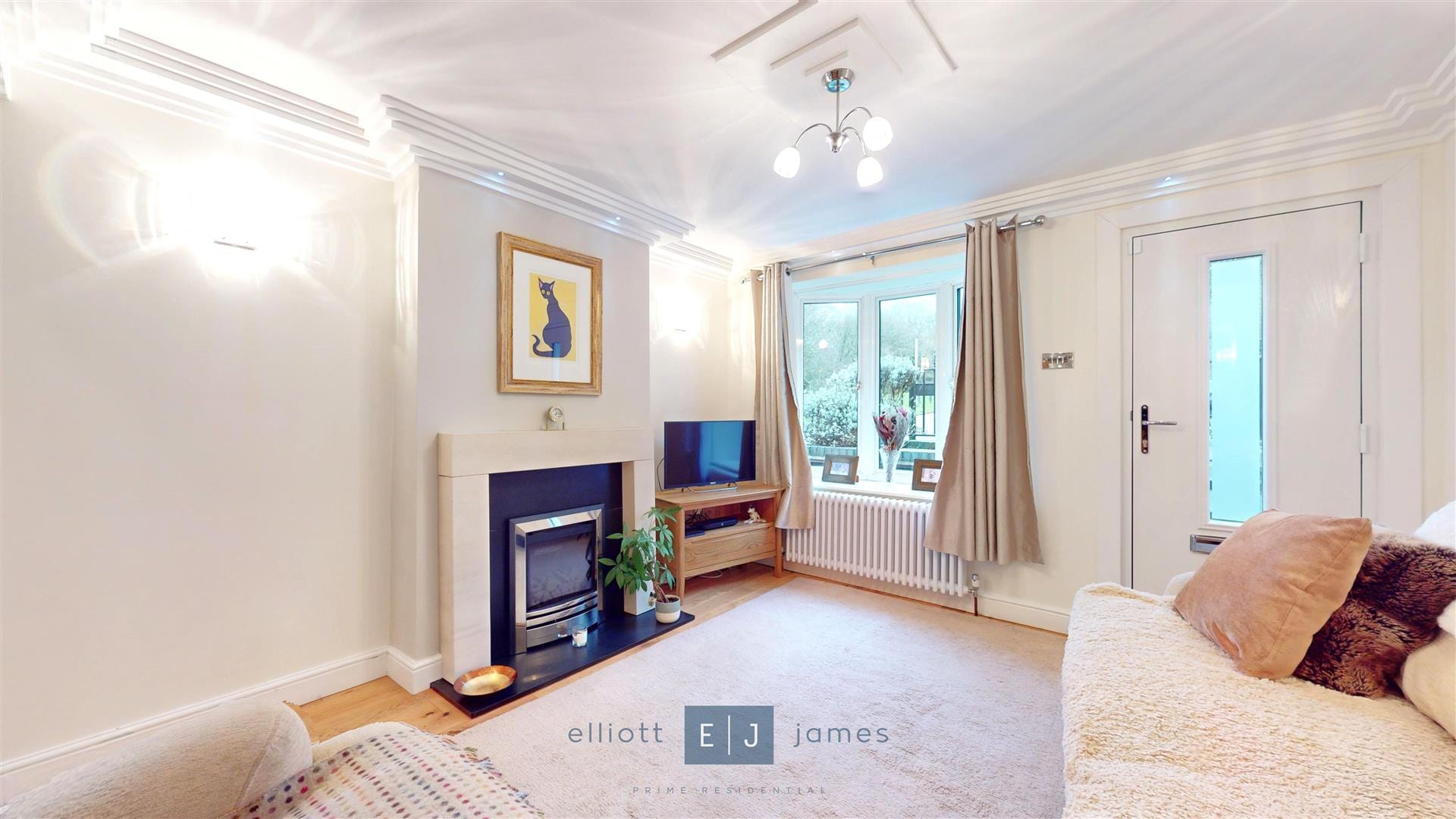 Upon entering, you are welcomed into a bright generous through lounge with fireplace, wood flooring and decorative celling cornice's with LED downlighting providing a warm and inviting atmosphere. To the rear of the property the modern fitted kitchen is well-equipped with fitted appliances and convenient ground floor utility/shower room.
