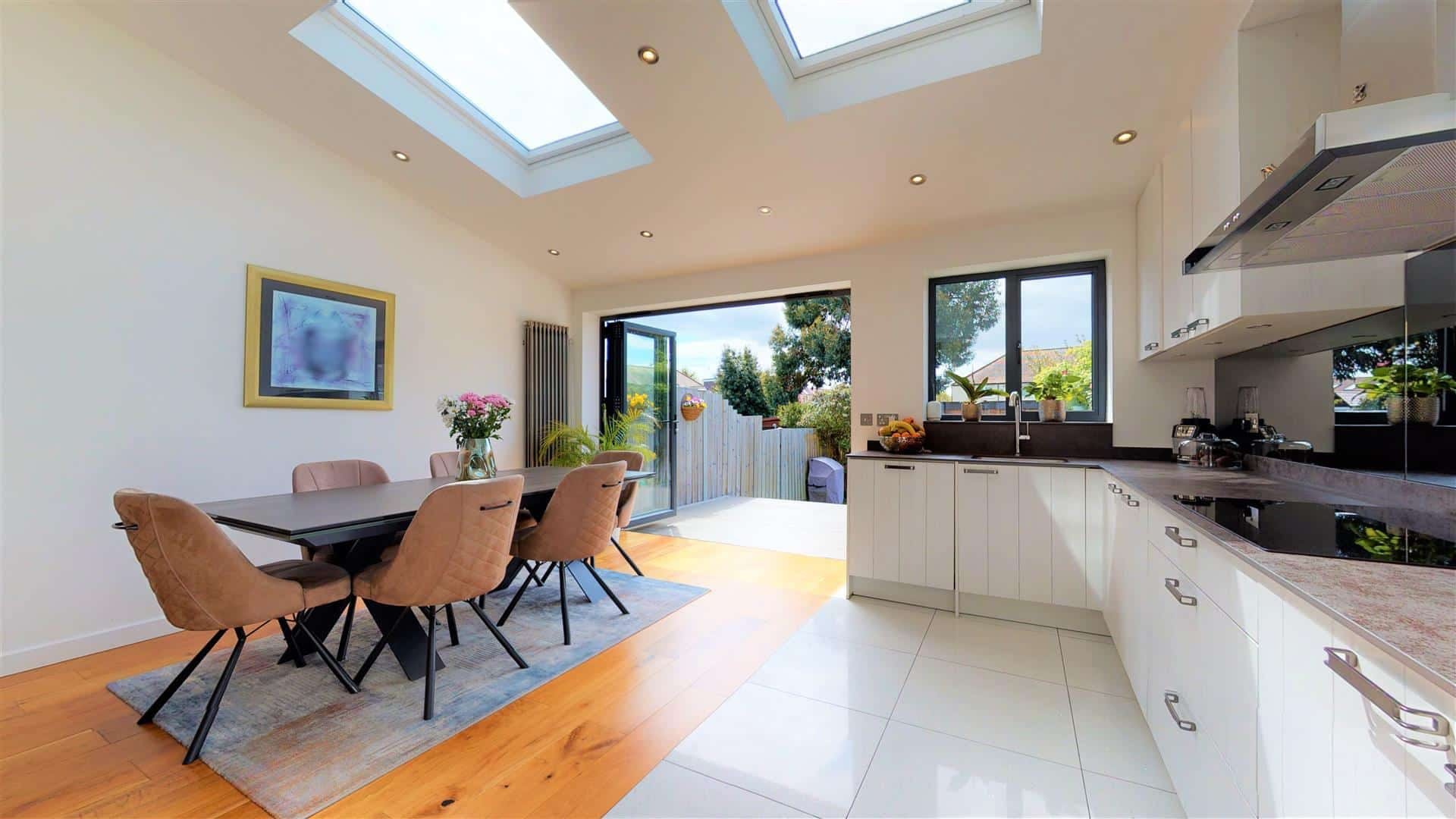 The accommodation is arranged over three floors with the ground floor comprising of bright entrance hall, spacious living room with bespoke built-in storage, cloakroom, lounge leading into modern open plan kitchen/diner which features integrated appliances as well as stunning bi-folding doors leading directly onto the private garden.
